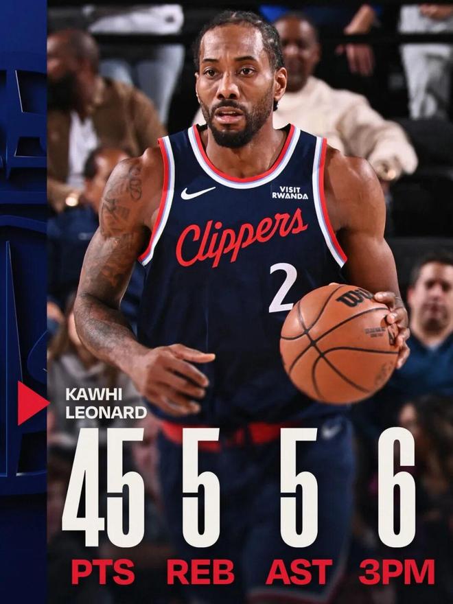 45分追平了倫納德的生涯第二高分(此前曾兩次拿到過45分),同時這也是倫納德本賽季的第5次40+,此前他曾單場拿過55分、45分、41分、41分。